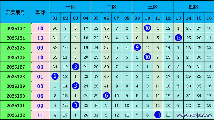 蓝球:前10期蓝球分散为:10 13 09 10 03 01 03 06 03 11,其中奇偶蓝球奇数球胜出,本期看兴趣数蓝球,参考蓝球01.
